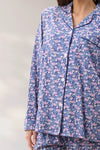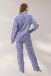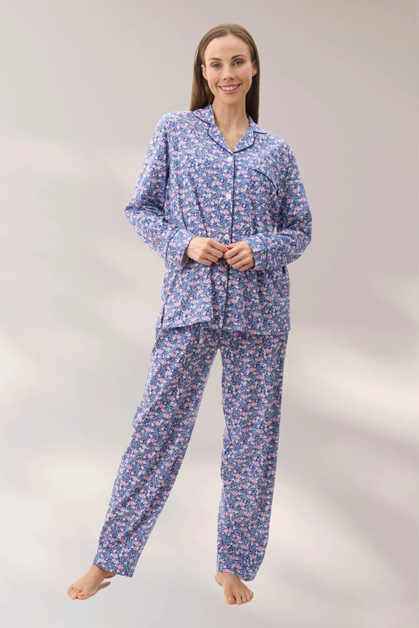 Long pyjama in a gorgeous royal print on soft and comfortable knit jersey. Classic styling with collar, chest pocket, and front button opening. Royal piping trim. The long pant has an elastic waist, and a drawstring.