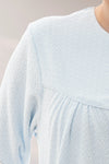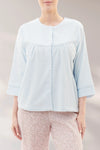 Wrap yourself in pure luxury with this self jacquard knit towelling bed jacket. With a button front with yoke and gathers, this effortless design is the perfect summer weight. Pretty satin piping trim and side inset pockets. Available in Sky and Pink.