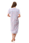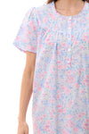 Short sleeve mid length nightie with a narrow self gathered frill on the neckline. Cool and comfortable woven cotton in a summery and fresh multi coloured print. The yoke has a 5 button placket opening, and small pintucks either side of the yoke. The skirt is softly gathered to the yoke.