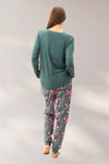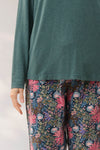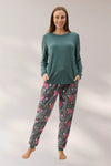 Cassidy Long ski pyjama in a modern multi coloured print on flannelette, warm and cosy for colder winter nights. Print pants with moss marle knit waistband, drawstring and cuffs. Moss marle round neck long sleeve top in slinky knit