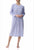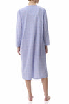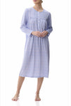 Mid nightie with long sleeves. Gorgeous petite blue floral print on cotton jersey. This nightie has a round neckline with detail piping underneath. It has a curved front yoke with pintucks spaced either side of the button placket. Soft gathers fall to the skirt from the front yoke.