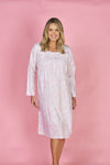 French Country's new trans seasonal long sleeve nightgown in a feminine pink and white floral print.  This long sleeve nightie features a square neckline with small lace trim and attractive pintucking detail on the bodice.  Made from high-quality woven cotton that provides a soft and comfortable feel against the skin. The non-stretch fabric is lightweight and breathable and sits mid calf in length.