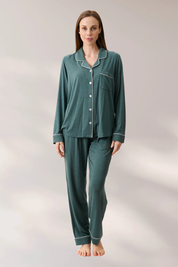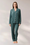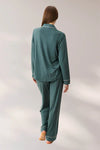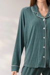 Long pyjama with long sleeves, full button opening, collar, cuffs, and shaped hemline. This beautiful soft knit pyjama has contrast ivory accents and a pocket at the left chest. The long pants have a comfortable elastic waist with a drawstring, and side detail pockets. MODAL knit is beautifully soft and comfortable.