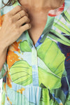 Escape into elegance with the timeless Evelin V layer Dress. Featuring a button up mandarin collar, a frill tiered skirt that falls at the knee, three-quarter frill sleeves, and unique lush botanical print, this dress is so easy to wear. The perfect dress for soaking up the sun on a warm summer day!