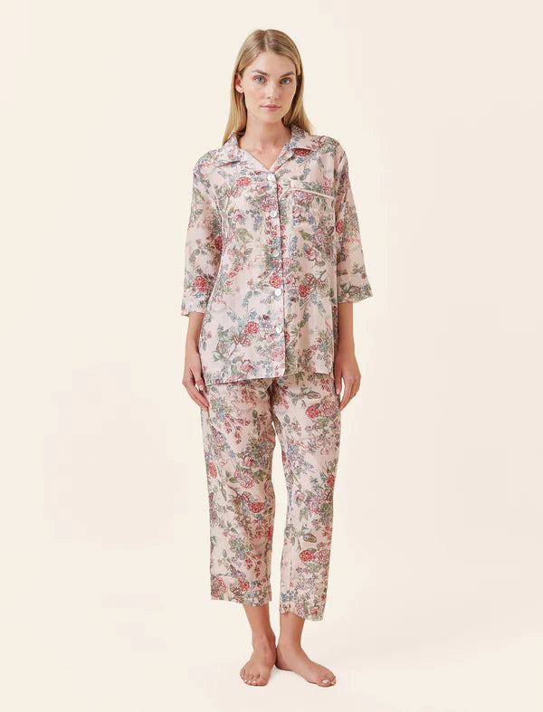 A light-as-air cropped PJ set designed for warm nights and relaxed mornings. Featuring a button-down top, ribbon trims, and an all-over floral print, it blends softness with timeless, feminine charm. Breezy and breathable, it’s a piece you’ll reach for night after night.