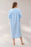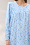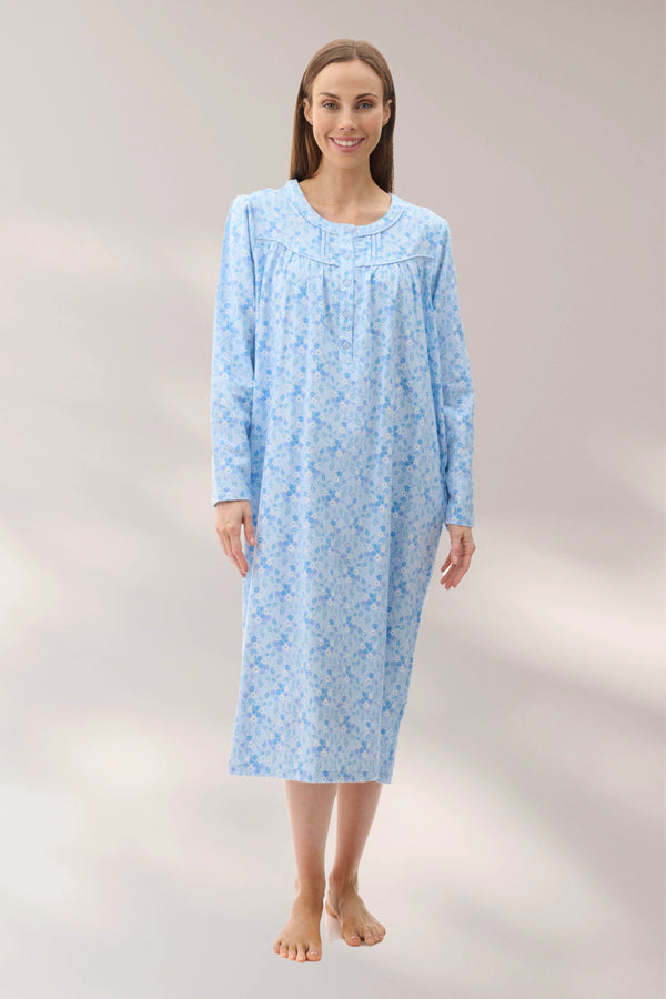 Aria Mid length nightie in the pretty blue floral print. The lovely styling is collarless with a button front placket. Cosy and warm fabric is ideal for the colder winter nights. A curved yoke with self piping and tucks. Soft gathering from the front yoke. Long sleeves with button closure.