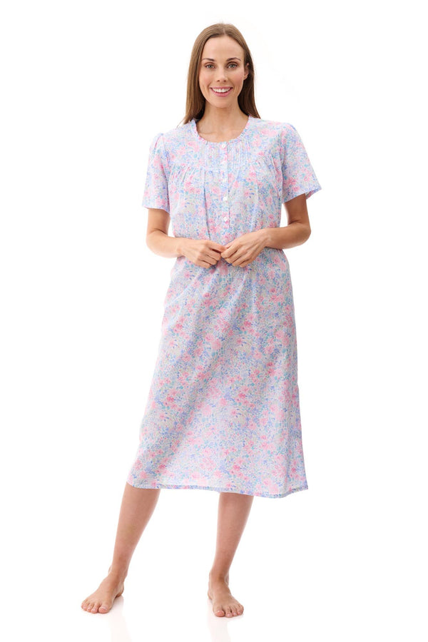 Short sleeve mid length nightie with a narrow self gathered frill on the neckline. Cool and comfortable woven cotton in a summery and fresh multi coloured print. The yoke has a 5 button placket opening, and small pintucks either side of the yoke. The skirt is softly gathered to the yoke.