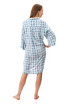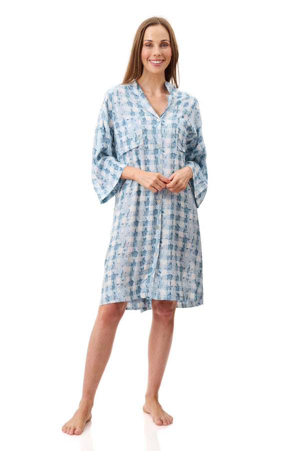 Introducing Narida, crafted from 100% woven viscose, this short sleepshirt offers a delightful blend of softness and feather-light hand feel. Tailored for your comfort, the styling is relaxed, featuring 3/4 sleeves and patch pockets. Adorned with a playful distressed check print, it's a refreshing twist on a timeless design.