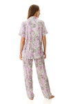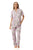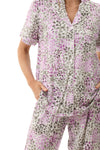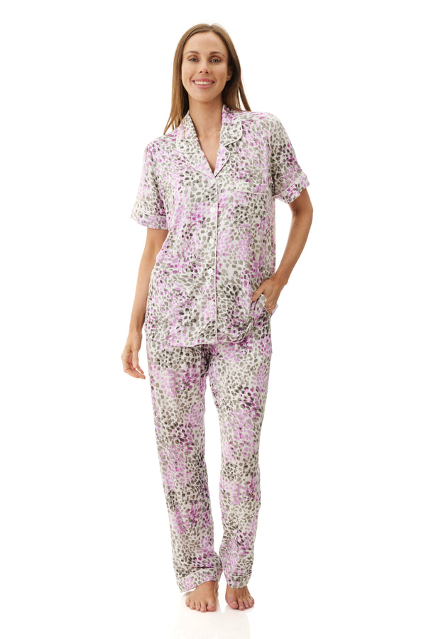 Dakota pyjama adds a modern twist to your sleepwear with a mauve and soft steel grey abstract print on white.   The top features a button front with a fresh contrast of white satin piping along the front opening, collar, cuffs and pockets.  Complete with convenient pockets on the pants, cuffs and a satin drawstring, providing the perfect blend of comfort and functionality for lounging and a peaceful night's sleep.  -92% TENCEL™ MODAL fibers 8% Elastane Printed Slinky Knit      -Top length:Size S= 66cm   - Pant length:Size S=95cm