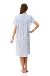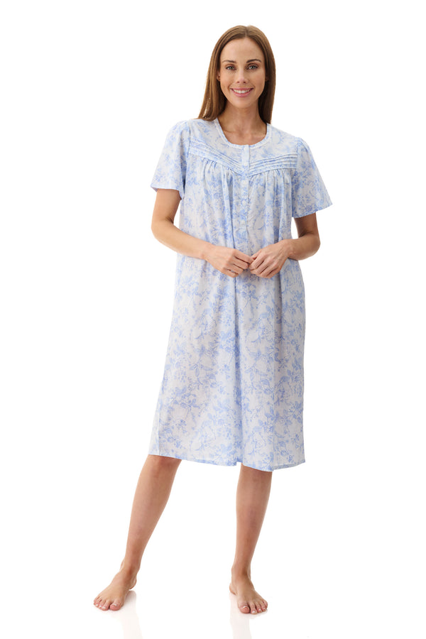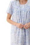 The Eliza print short sleeve short nightie features a fresh floral print in blue and white tones, perfect for warmer nights.  It is styled with a round neckline trimmed in white lace, adding a soft, elegant touch with softly gathered sleeves. An angled straight front yoke with narrow pleats and a front button placket adds subtle detail, while gentle gathers from the yoke allow the skirt to fall with ease and flow.       -100% Cotton Printed Woven.      -Length: Size S=104cm