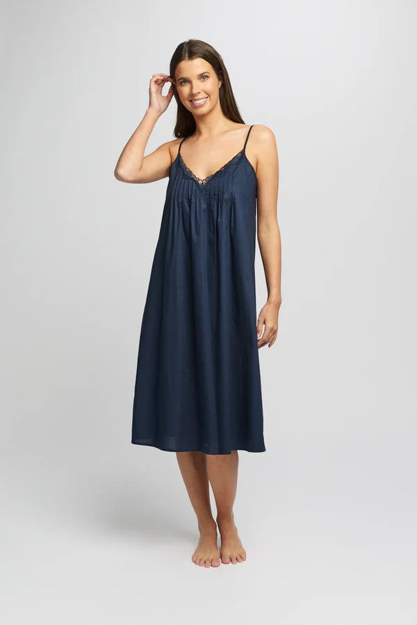 Featuring a lace trim neckline with pintucks and adjustable straps. Available in Navy & White with Matching Robe