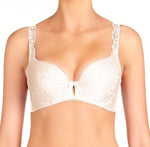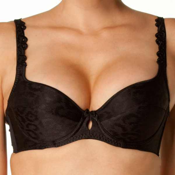A flattering, comfortable and supportive everyday contour bra in self patterned jacquard satin. Guipure lace embroidery adorns the straps and keyhole detail and bow at the centre front.