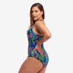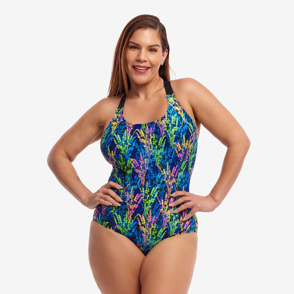 A classic one piece that features form flattering princess-line side panels with a low leg line, suitable for a DD-E Cup. With wide, comfortable criss cross back straps and a mini keyhole design feature this style is perfect for your active lifestyle. Includes double front lining, shelf bra, padded cups and mastectomy pocketing.
