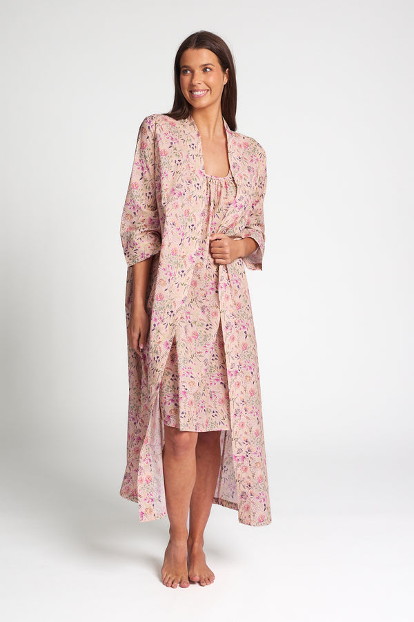 • Product Description:  Full length Robe in Iris Print.