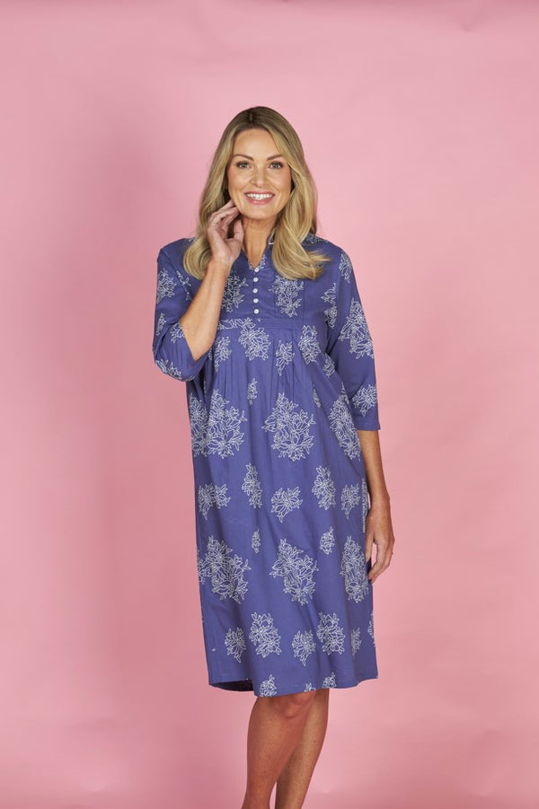 A loose fitting nightie, in a non-stretch cotton. This floral print nightie has a high, yoked back. The front has a v-neck and deep buttoning placket. The bib front is detailed with pintucks. A matching dressing gown (FCC404) is available.