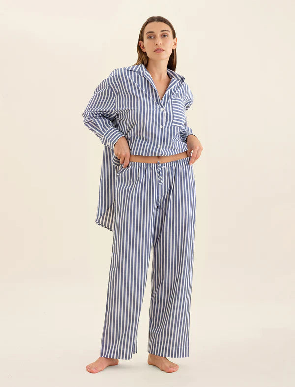 This classic blue and white striped, 100% Cotton PJ is the perfect fit for everyone. The relaxed, oversized design is so comfortable you will never want to take it off!