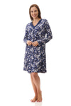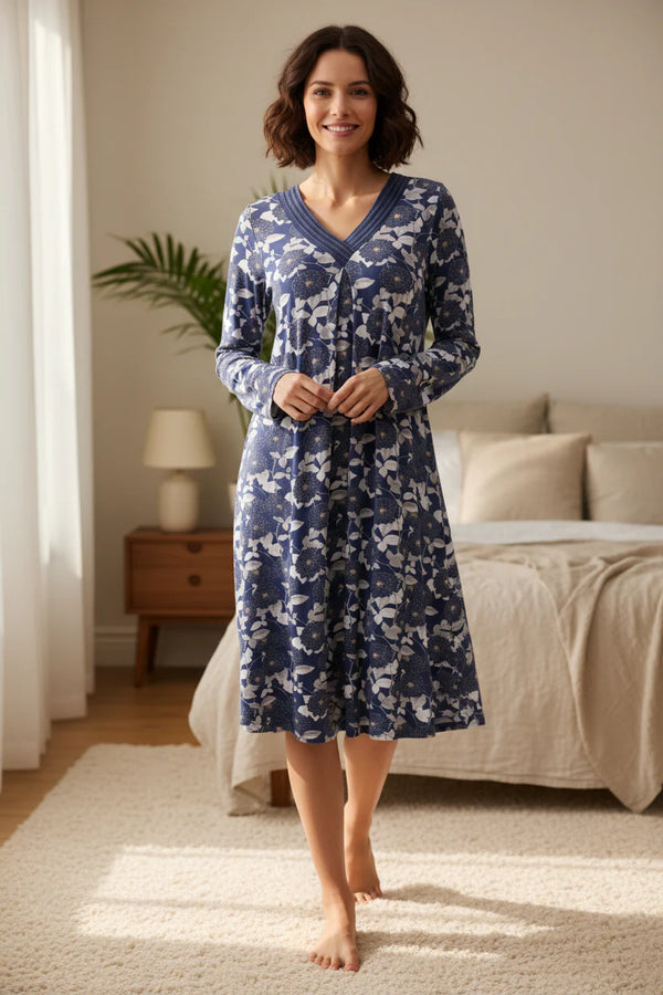 "Short length knit nightie in the striking Navy based print ""Coco"". Featuring elegant satin and mesh detailing on the ""V"" neckline, this nightie is the epitome of comfort and luxury. Our slinky knit is beautifully soft and comfortable to wear.