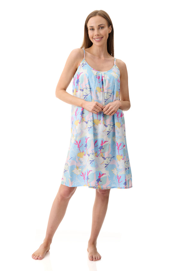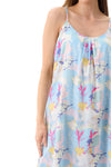 Discover our Xander vibrant print with a breezy blue base with splashes of summery playful print details. Crafted from 100% breathable cotton this short chemise features neckline gathers, adjustable straps, and elastic shirring at the back, for a better fit. The soft breathable fabric brings a modern pop of color and effortless energy—perfect for warm-weather lounging and dreamy summer nights.     -100% Cotton Printed Woven      -Length: Size S= 95cm