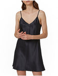 Crafted from pure silk, this chemise flatters the female figure with a V-neck, thin adjustable straps and flared skirt.