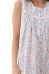 The Faye printed sleeveless short nightie is a perfect blend of comfort and style, featuring a summery, multi-colored print that brings a fresh and vibrant feel to your sleepwear collection. This nightie is designed with a self fabric binding around neckline and armholes. Detailed with a button placket opening, front yoke with small pintucks on either side, creating a refined and feminine look. The softly gathered skirt flows gently from the lace trimmed yoke, offering ease and comfort throughout the night.                                     -100% Cotton Printed Woven                        Length: Size S =  104cm