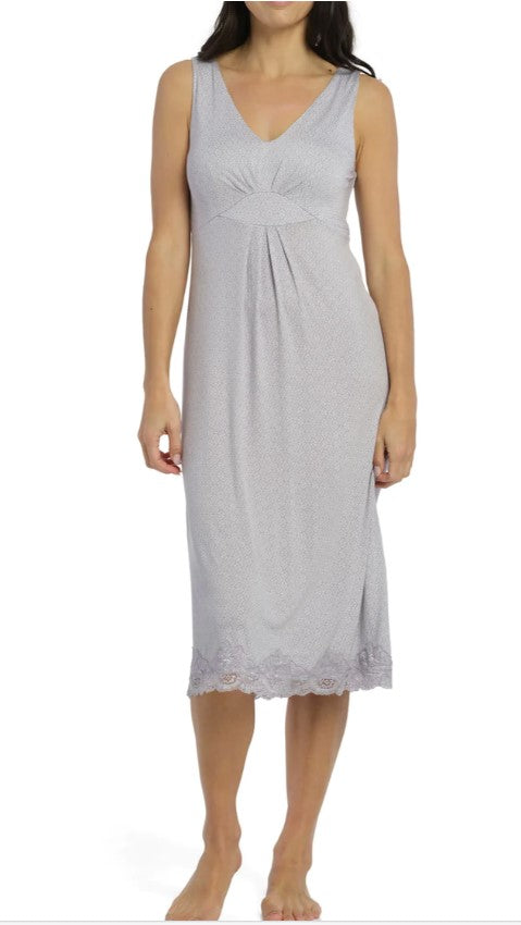 Adorned with a delicate grey and white tile print, the chemise has a relaxed A-line fit that gently drapes over the body. It's accentuated by a front gathered detail and delicate lace trim that exudes femininity.