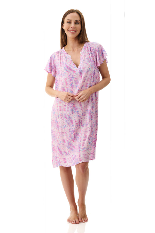 Introducing our Reese flutter sleeve short nightie - the epitome of style and comfort for warm summer nights.  This flutter sleeve nightie is crafted from 100% woven viscose.  It features flutter sleeves, soft gathers on the body and an open v neckband.     Light soft and cool, this swirly abstract print pyjama set is perfect to wear on warm summer nights.                                       -100% Viscose Printed Woven          -Length:  Size S = 95cm