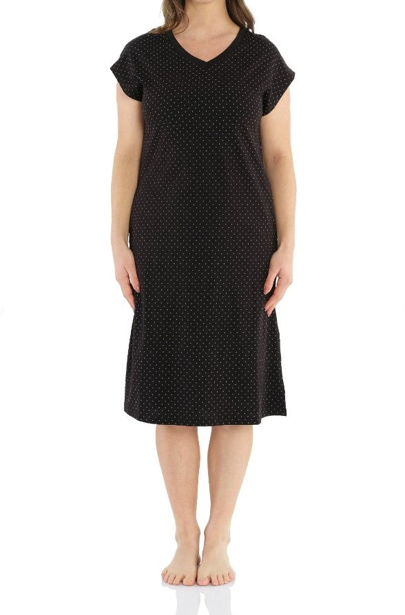 This stylish nightie showcases a classic black and white spot print and is designed with short sleeves, a flattering V-neck, and handy side pockets for added convenience. The breathable fabric and moisture-wicking properties keep you cool and comfortable, night after night.