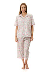 The beautiful Viviene floral print adds a touch of elegance to our short sleeve pyjama. Crafted from 100% woven cotton the pyjama top has a button front opening, collar and chest pocket.  The capri length pyjama pants have side pockets and an elasticated waist and tie.   The soft, breathable cotton will lull you into a peaceful slumber.       -100% Cotton Printed Woven        Top length S=68cm Pant length S=75cm