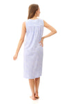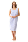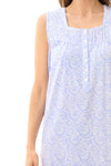 Fresh blue and white print on beautiful 100% cotton knit jersey. This short nightie is a lovely choice for hot summer nights. This is a sleeveless short nightie with a pintucked yoke with lace trim. Soft gathers to the skirt. There is a front button opening.