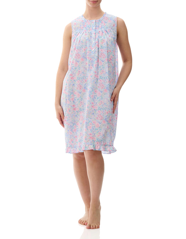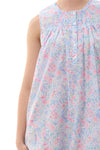 This sleeveless nightie sits just below the knee with a sweet frill on the hem. The neckline has a narrow self gathered frill. The yoke has a 5 button placket opening, and small pintucks either side of the yoke. The skirt is softly gathered to the yoke. Bridget print is a summery and fresh multi coloured print. Complete your look with Bridget Bruchcoat worn over the top.