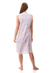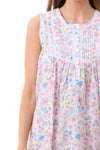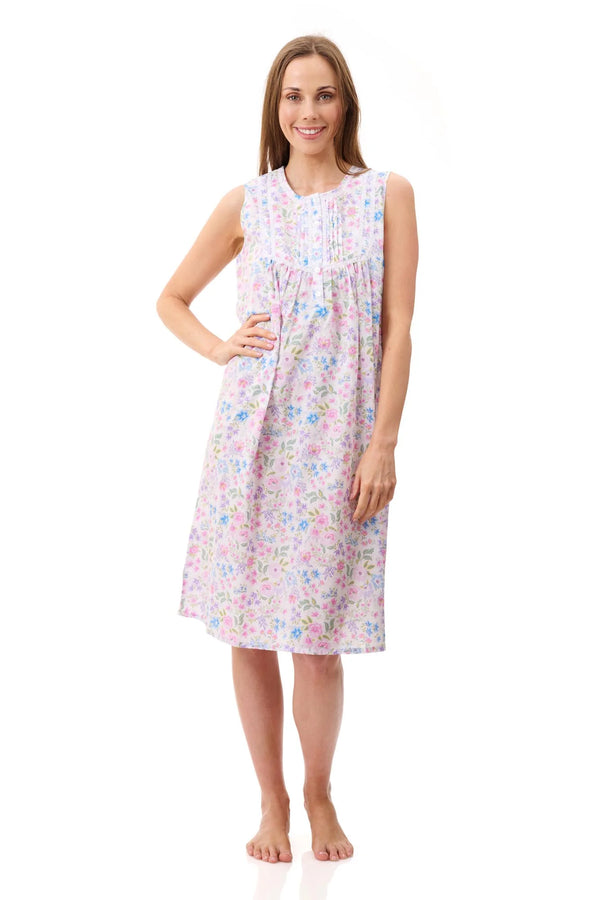 Sleeveless short nightie in a petite floral. 100% woven cotton is a light and cool choice for summer. The sleeveless nightie has white lace trim edging the neckline, front button placket and bodice, soft gathers fall from the front bodice. The back skirt of the nightie is slightly gathered into the back yoke giving a lovely drape.