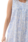 The Eliza print sleeveless short nightie features a fresh floral print in blue and white tones, perfect for warmer nights.  It is styled with a round neckline trimmed in white lace, adding a soft, elegant touch. The sleeveless design includes binding around the armholes for comfort and clean finish. An angled straight front yoke with narrow pleats and a front button placket adds subtle detail, while gentle gathers from the yoke allow the skirt to fall with ease and flow.  Add the matching Eliza brunchcoat to create a fresh, crisp summer set.       -100% Cotton Printed Woven.      -Length: Size S=104cm