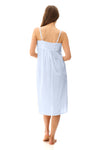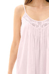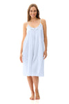 Short chemise with adjustable straps and elegant lace motif at the front with pintucks. Elastic shirred back for comfort and a perfect fit. 100% woven spot dobby cotton is a summer weight fabric keeping you cool and elegantly comfortable. Available in Blue, Pink and White