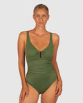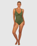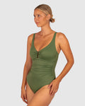 Baku's Rococco D/E Ring Front One Piece Swimsuit features a flattering dropped neckline with a tortoise shell ring at the front. It has hidden underwire with power mesh stability, boning and continuous shelf support. It also features a soft edge front, adjustable straps, tummy control & ruching and is fully lined.