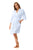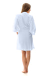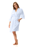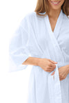 Short wrap gown with self bands, elbow length sleeve and tie waist. 100% woven spot dobby cotton is a summer weight fabric keeping you cool and elegantly comfortable.   Available in Blue, Pink and White    -100% Cotton Woven Spot Dobby.      -Length S:100cm